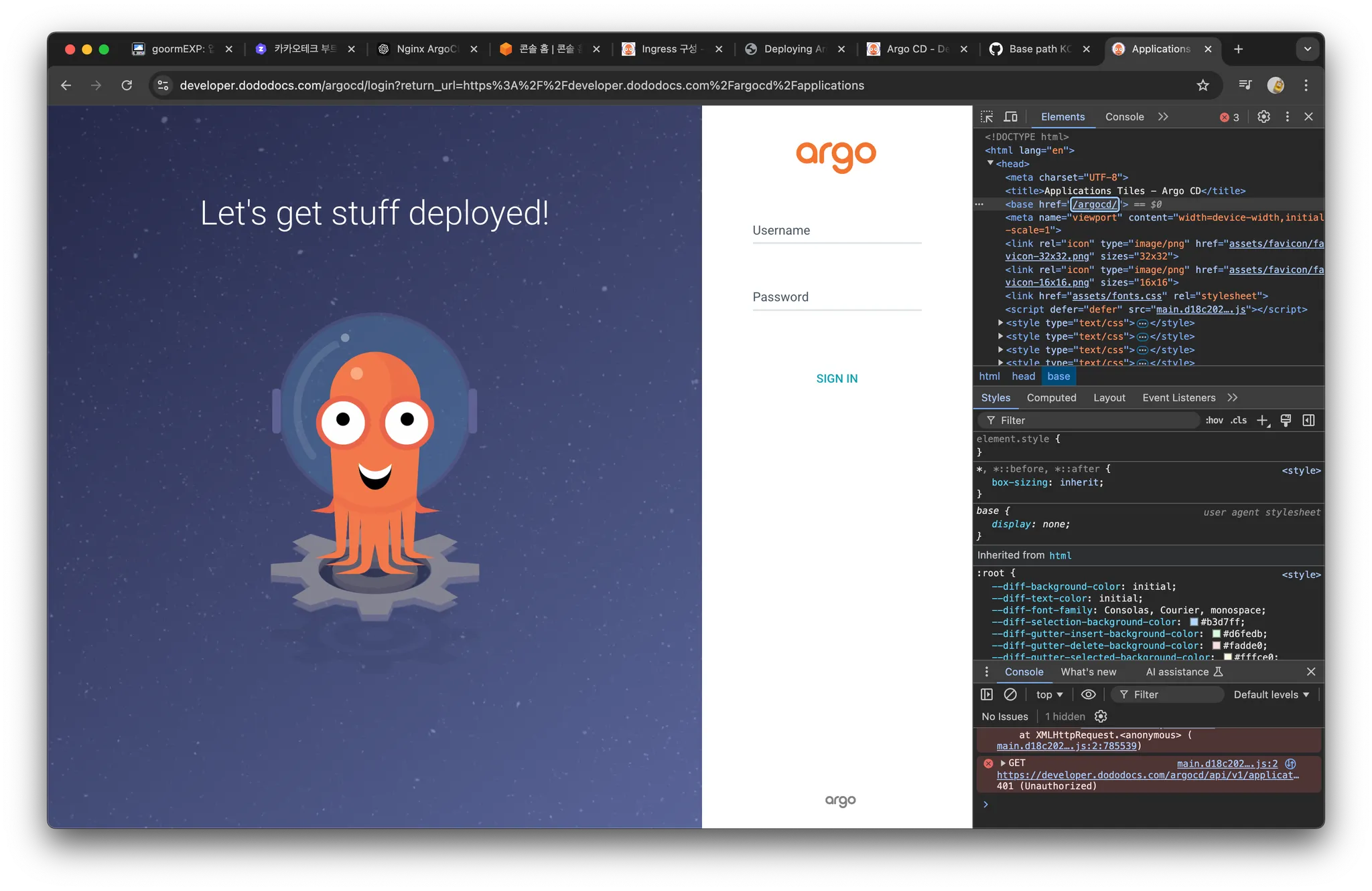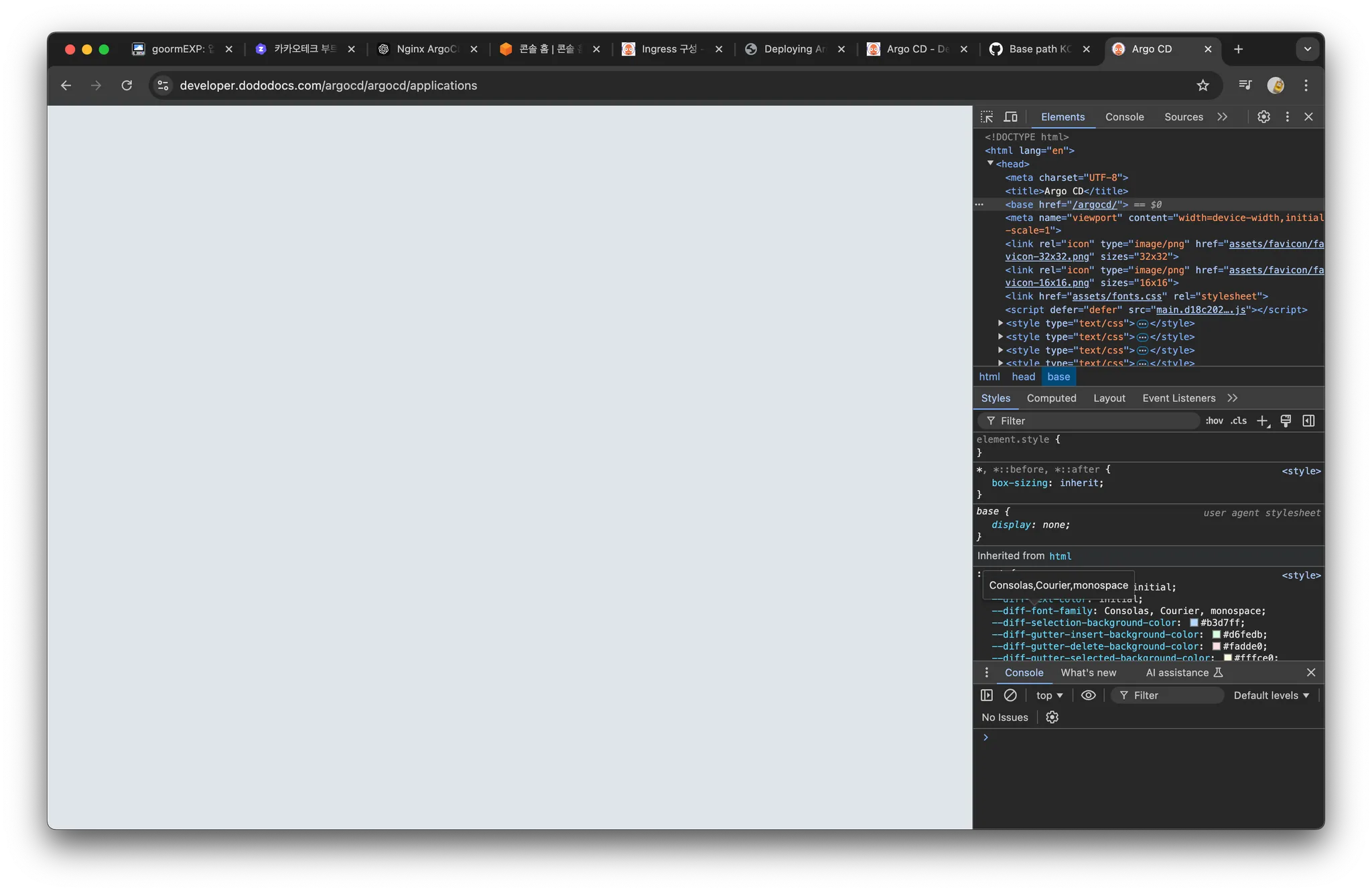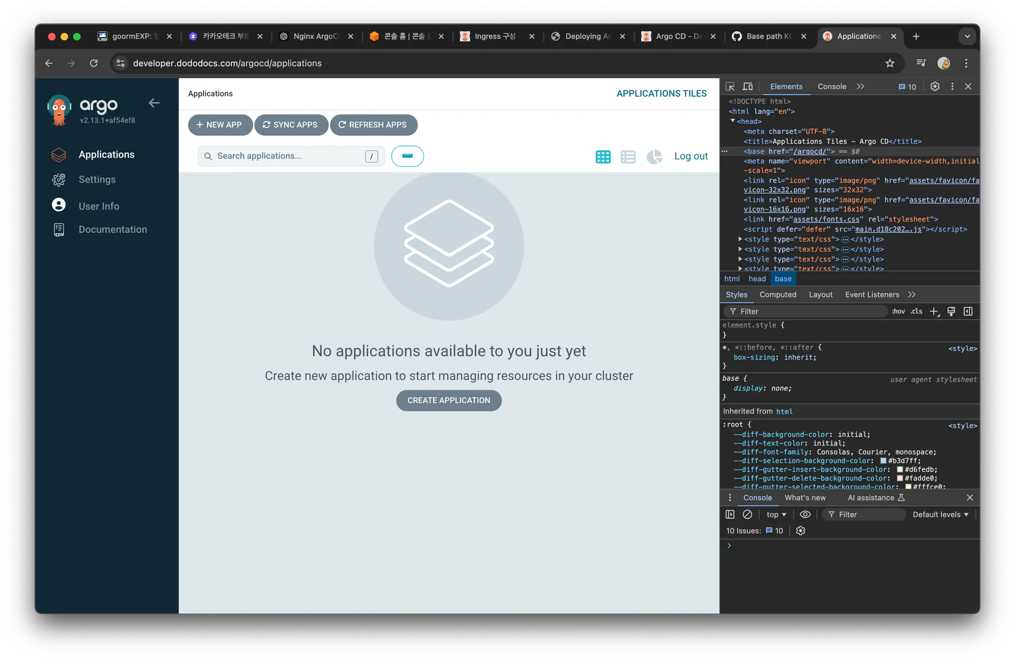 - /argocd와 /argocd/argocd/applications ,/argocd/applications 웹 대시보드 > 개발자도구 > 콘솔 확인시 <base href="/argocd/"> 인 것 확인