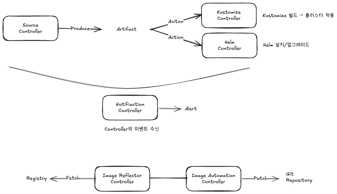 - Image Automation Controller: OCI 레지스트리의 최신 이미지 태그를 검사하고, Git 매니페스트의 이미지 태그를 자동으로 업데이트